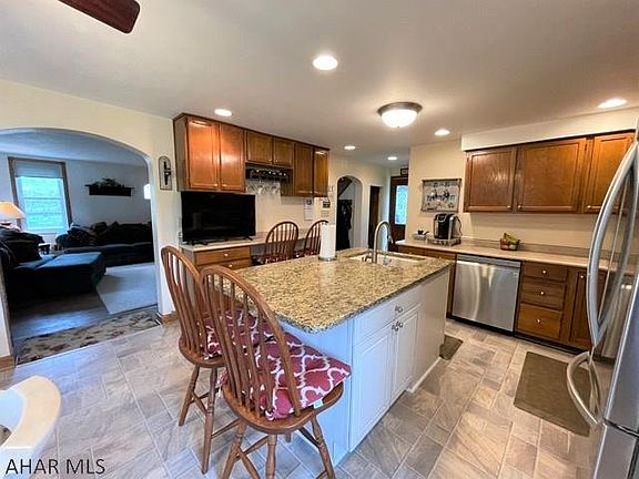 Very well maintained two-story home resting on a DOUBLE lot!! This home has been nicely updated & very well cared for. The main level offers a large LR, updated eat-in kitchen w/ center island & dining area, laundry & half bathroom. Second level has three bedrooms & a full bathroom. Hardwood floors, a walk-up attic that is great for storage & a full basement. Basement area is partially finished w/ a with bathroom, oil hot water heat, wood burning boiler, 200-amp electric & ground level walk-out. Side covered porch & side deck to enjoy some great views & relaxation. Updated metal roof, vinyl siding, & replacement windows. The double lot provides a large yard, garden area & off-street parking.
