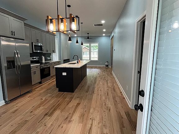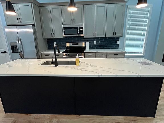 The kitchen, with its large center island, comes with all new stainless appliances, ample cabinetry and a beautiful stone backsplash and quartz countertops for preparing all those great meals for family and friends.