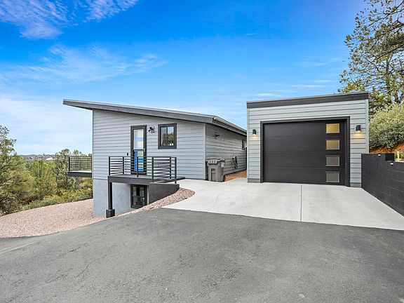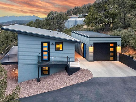 Mountain living in modern style. This sleek, thoughtfully designed modern home emanates character with each room offering a view. Mountain views of the Mazatzal and Granite Dells, and peek-a-boo views of the Mogollon Rim! As you enter, your focus will be drawn to the large, stunning windows and slider that leads out to the deck to enjoy the views, fresh air, and wildlife that visits. Main level also features large bedroom with deck access and walk-in closet. Lower level features family room area, which could be used as additional sleeping, and another bedroom and bath. Lower level rooms having access to the exterior by sliding glass doors. Low maintenance Trex deck with wrought iron railing and a metal roof on both the house and garage. No rental restrictions! Circular driveway. This home is not the typical home you see in Payson, must see to appreciate!