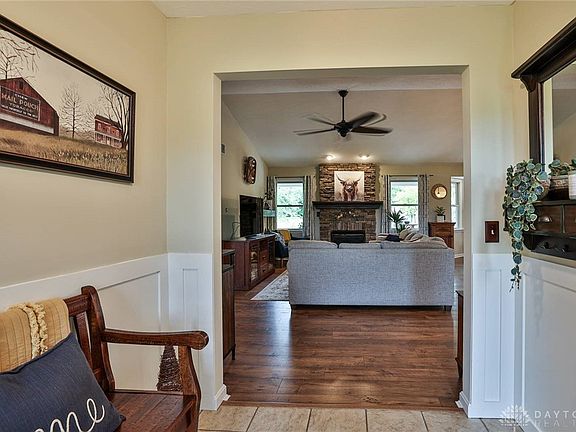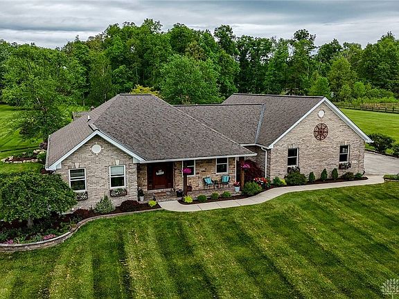 Stunning 3 BR, 3 bath brick ranch w/study on fin. bsmnt! 5+ acres w/koi pond, cabin, multiuse building, shed & coop! Blacktop drive, concrete parking & att. garage! Tiled porch w/ceiling fan! Foyer w/wainscoting & ceramic tile! GR w/vaulted ceilings, laminate floors & accent walls! LR w/stone gas burning fp! Kitchen w/refaced cabinets, granite counters, reclaimed wood bar, cast iron/enamel sink, pantry, under cabinet lighting & SS appliances! Breakfast nook w/bay window! Primary suite w/vaulted ceilings, shiplap, barn door to full bath w/heated tile floors, tile shower, double vanity w/concrete top, clawfoot tub, linen & walk-in closets! 2 BRs & office w/amazing views! Laundry w/folding counter, coat & storage closets! LL w/carpet, accent walls, barn door, family room, kitchenette, full bath, laundry & multiuse room! Concrete patio w/granite bar, recessed lighting & ceiling fans! Hardwired lighting, paver walk-ways, bridge & pond w/waterfalls & underwater lighting! See feature sheet!