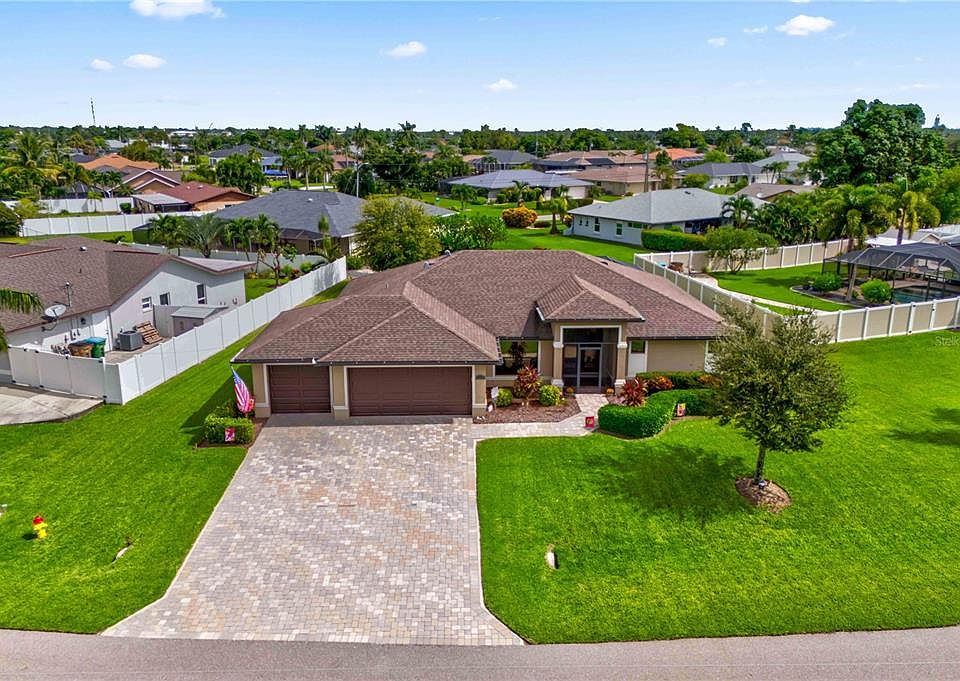 NO FLOODING from Hurricanes! This home truly checks all the boxes for those seeking comfort, style, and luxury! Nestled on an oversized corner lot, this gem boasts three spacious bedrooms, a den, and an impressive 3-car extended garage. Step outside and you'll find a sparkling pool paired with an expansive outdoor living area, perfect for entertaining or quiet relaxation. Even better, all assessments have been paid, and the property is located in a NO FLOOD ZONE— this home is on a high elevation! Meticulous care is evident throughout the home, and the pride of ownership shines from the moment you arrive. A long, extended paver driveway flanked by lush, manicured landscaping leads you to the double-door entry. The welcoming front porch is screened in for extra comfort. Inside, the home opens into a magnificent great room with stunning double coffered ceilings that provide a touch of elegance and grandeur. The open kitchen is a chef’s dream, featuring a large granite island and an abundance of cabinet and storage space. Natural light floods the adjacent den, a perfect space for a home office or reading nook. The thoughtfully designed layout offers privacy for the two guest bedrooms, bath, and laundry, all in a separate wing. Meanwhile, the master bedroom retreat provides a peaceful sanctuary with sliding glass doors leading to the backyard, a spa-like bathroom with an oversized shower, and a spacious walk-in closet. Step out back and you'll find a true outdoor oasis! The oversized covered lanai and entertainment area, complete with a refrigerator and sink, make this the perfect space for gatherings or quiet nights at home. The pool sparkles invitingly, and the semi-private view ensures a sense of seclusion and tranquility. The garage is a true three car extended garage and should fit most extended trucks or vehicles. The floor has been epoxied and as with the rest of the home in meticulous shape! And if location is important, this home is ideally situated—close to everything with easy access to Fort Myers. It’s a 10 out of 10! There is also a low cost, assumable Flood Policy.
