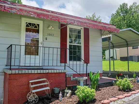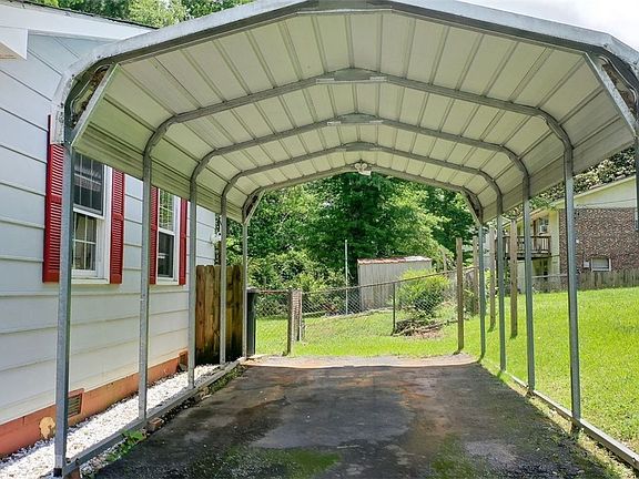 Outside, there's a carport, two porches (one screened), a large storage building with power, and an additional shed in the backyard.