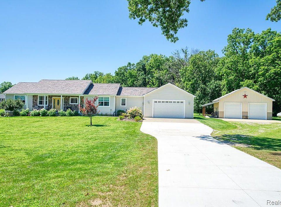 With pleasure we welcome buyers to indulge in the ultimate luxury living experience with this 2015 skillfully designed, split planned ranch home. On 3+ ACRES and complemented by a spacious 30'x40' outbuilding with 220 service, concrete floor and driveway, H + C water and 10' overhead doors. Expansive open concept home design featuring refined finishes, storage and 3600 sq ft of finished living space is sure to leave a lasting impression. Top of the line interior and exterior, no expense was spared. New roof (2023), new barn, new paved driveway, back-up whole house generator, high-efficient mechanicals, 200-amp service (house). Extensive recessed lighting inside the home creates the perfect ambiance whether relaxing or entertaining. Gourmet kitchen with premium 42" custom cherry cabinets, tumbled marble backsplash, soft-close drawers, SS appliances and stunning granite countertops complemented by subtle cabinet lighting. Patagonian rosewood flooring and upgraded fixtures make the living room and dining room shine. Jaw-dropping primary suite showcases a large walk-in closet with organizers, an en-suite bathroom featuring ceramic tile floors, a contemporary tiled shower with rainfall showerhead, large storage closet and a chic stone counter vanity. Slate tiled first floor laundry with linen closet, organizers and extra storage; hookup for gas or electric dryer, (currently running off gas). Completely finished basement that doesn't feel like a basement at all with 9' ceilings, daylight windows, tiled family and rec room, 2 large bedrooms, a full bath and upgraded utility room with new sump pump, water treatment and R/O system. Oversized (32x33) 2 1/2 car garage, drywalled and insulated with garage door openers. Additional features include excessive blown-in insulation to keep costs down all year, a covered porch, fresh stained deck off the kitchen and additional 14x16 Rosetta stone patio. Tilt out JW windows. All appliances included. Did we mention? NO HOA! Don't wait, call today and get inside of this home. BATVAI