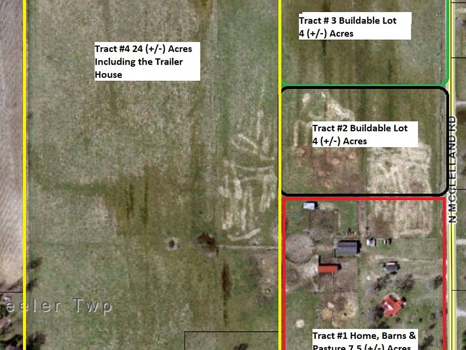 Darryl & Rosemary Dosson Real Estate Online Auction This 40+/- Acre farm will be sold in an online auction as a MULTIPLE TRACT auction! This means you will be able to buy 1 Tract or any combination of the 4 Tracts. Tract #1 will be the Home and Barns = 7.5 (+/-) Acres Tract #2 will be a buildable Lot with McClelland Rd Access = 4 (+/-) Acres Tract #3 will be a buildable Lot with McClelland Rd Access = 4 (+/-) Acres Tract #4 will be the remaining west portion of the farm including the trailer & lot along Jefferson Rd. = 24 (+/-) Acres Please use the practice auction to get the feel of how the multi tract auction works! There will also be an option in the auction to combine all 4 tracts if you would like to buy the complete farm. Please keep in mind that the AUTO BID feature will not work in a Multi Par Auction! The bid price you type in will be the bid price!