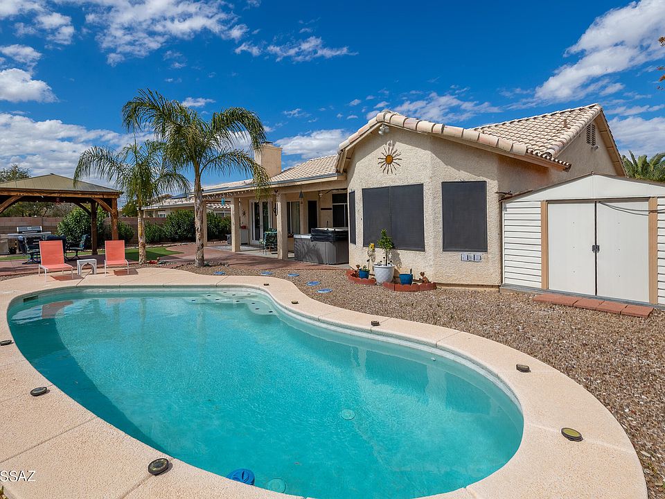 Looking for a move in ready w/ a large yard, fruit trees, planter boxes, pool, gazebo w/ a TV & Surround sound, BBQ Grill & outdoor sink. Covered patio w/ another TV, & Hot Tub. On the side of the home is a storage shed w/ electricity, double gates w/ a concrete pad to park an extra car, boat or small RV. That's just the beginning, updated kitchen w/ granite counter tops, opens to the family room w/ fireplace & dining nook. Beautiful new French doors that take you to your relaxing oasis of a yard. Paneled doors throughout. Well-appointed window coverings, new fans in the family rooms, large master bedroom w/ dual sinks, jetted tub, separate shower, & walk-in closet. The 3 extra bedrooms all have good-sized closets. All tile, no carpet. Garage has storage cabinets. Items that will stay in the home are the 3 TV's, Shelf unit in Dining area, 2 large paintings in the formal family room. Seller has never used Pool Heater will convey As Is!!