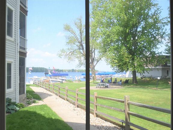 LEAST EXPENSIVE CONDOMINIUM CURRENTLY AVAILABLE ON WAWASEE.. ..... A 2 BEDROOM 2 BATH GROUND FLOOR CONDOMINIUM with a boat slip and 1 PWC slip. Cozy enclosed porch for almost year round use over looking the waterfront. Move in ready...freshly painted, newer flooring, granite kitchen counters, solid surface in both bath rooms. Both bedrooms are spacious with ample closets. ...you can move in and enjoy living the lake life. Other newer items include the furnace, windows, appliances. Secured parking for cars and boats across the road along with a one car garage. Sit in your porch and ejnoy the lake view or move to the common deck and enjoy the beautiful sunsets down the length of Lake Wawasee. Low maintenance fees make this an economical place for year round or seasonal living. Pet Friendly complex.