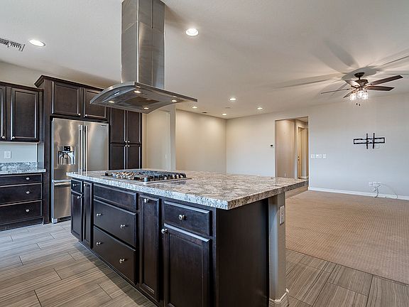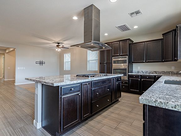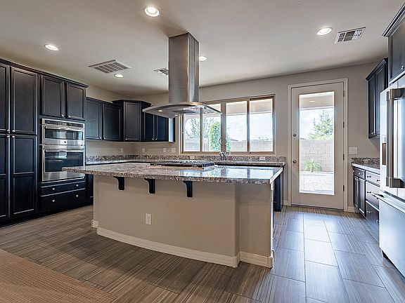 You'll love this highly upgraded, newer home in family-friendly Eastmark that offers 3 bedrooms + den & 2 baths in 1845 SqFt. Great room floor plan with split bedrooms. The gourmet kitchen features dark maple cabinetry, gorgeous granite countertops, stainless appliances, island with gas cooktop & range hood, and large picture window that opens to the patio bar counter, perfect for indoor/outdoor entertaining! The backyard has a full-length covered paver patio, grass for kids & pets to play on, & no backyard neighbors. The master retreat has private exit to the patio, tray ceiling, and en-suite bath with dual sink vanity, oversized tiled shower with rain showerhead & walk-in closet. Other features include an oversized 2 car garage, paver driveway, neutral decor throughout and much more! 1 year minimum. Discount for multi-year.