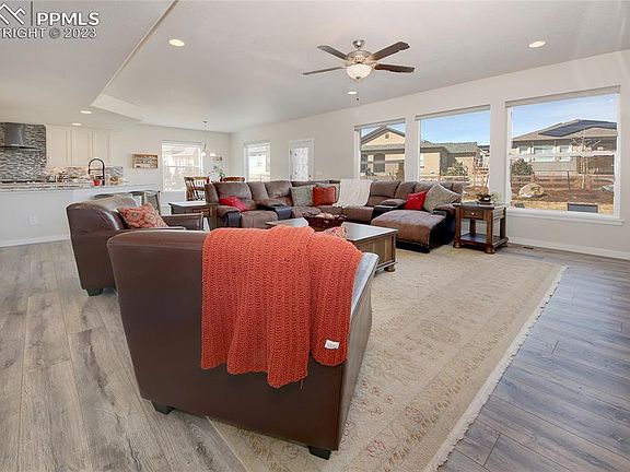 Welcome to your new home located in the highly sought-after Wolf Ranch community! This stunning property has 4,428 square feet of living space, featuring 6 bedrooms, 5 bathrooms, and a 3-car garage with a 4’ extension. Prepare to be wowed by the extensive upgrades throughout the home! As you step inside, you'll find a formal office and a beautifully designed kitchen with upgraded cabinetry and hardware, under cabinet lighting, black stainless steel Kitchenaid appliances, quartz countertops, an expansive counter bar, walk-in pantry, farm sink, five burner gas range, and black stainless steel vent hood. The main level also includes a built-in mud bench/nook, drop zone, and gas fireplace. The oversized upper level laundry room is complete with washer, dryer, and cabinets. The basement features a wet bar with upgraded cabinetry and wine rack and gas fireplace. Relax and unwind on the expanded back patio with a gas fire pit, perfect for entertaining. The main level includes an office, powder bathroom, formal dining room, open-concept living room, eat-in kitchen nook with a walkout to the patio, designer kitchen with a walk-in pantry, mud area, and garage access to complete the level. Upstairs, you'll find a large loft, a primary suite conveniently tucked away from the other bedrooms with an attached upgraded ensuite with barn door and a large walk-in closet, three more bedrooms, a full bathroom, and an oversized laundry room. The oversized laundry room is complete with washer, dryer, and cabinets. The fully finished basement is inclusive of a large family/rec room, wet bar with upgraded cabinetry and wine rack, gas fireplace, powder bathroom, two bedrooms (one is a secondary suite with a full bathroom). This home is ideally located close to the rec center, playgrounds, lake access, walking paths/trails, and offers easy access to Powers & I-25, D20 schools, hospitals, shopping, restaurants, businesses, entertainment, and more. Buyer to verify all room measurements.