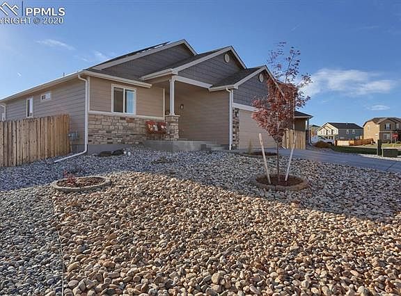 One of the most popular floor plans in Lorson Ranch is available for its next buyer! This 4 bedroom, 3 bed ranch home has tons of space and lots of options! When you enter, you will find a bedroom in the front of the home as well as a full bath. The kitchen has granite countertops, tons of cabinet space, an island, stainless steel appliances and a nice sized pantry. There is also a separate dining nook. The living room has plenty of space for entertaining. The master bedroom is also on the main level with a walk in closet, attached bath with double vanity and separate tub and shower. The basement is finished with a nice recreational area. There are two additional bedrooms and a full bath on this level. The backyard is spacious with views of pikes peak. Do not miss this amazing home!!