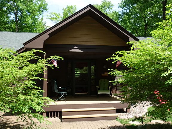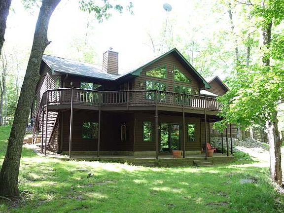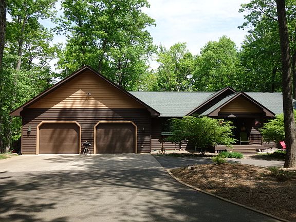 This exceptional 4BR/3BA Timber Ridge home has the best of both worlds - private & close to recreational amenities. Situated on over 2 wooded acres creates a quiet location. Plus you are close to golfing, swimming & trails. As you enter the open concept LR/KT & DR you will notice the maple wood floors & cathedral knotty pine ceiling. Wall of windows in the LR provides amazing forest views & all accented w/the brick wood FP w/insert. Sliders off the LR lead you to a spacious full length of home deck. KT boasts Hickory cabinets & breakfast bar. MBR has sliders to access deck & master BA w/double sinks. Another BR/Office & BA finish the ML. LL walkout w/patio sports a family room w/dry bar, 2 more sizable BRs & tiled BA. There is a sizeable laundry & plenty of storage. From mud room you can access oversized 2 car att heated gar w/black top circle driveway. This marvelous property is beautifully landscaped. Lot 132 is also available to purchase to create more privacy.