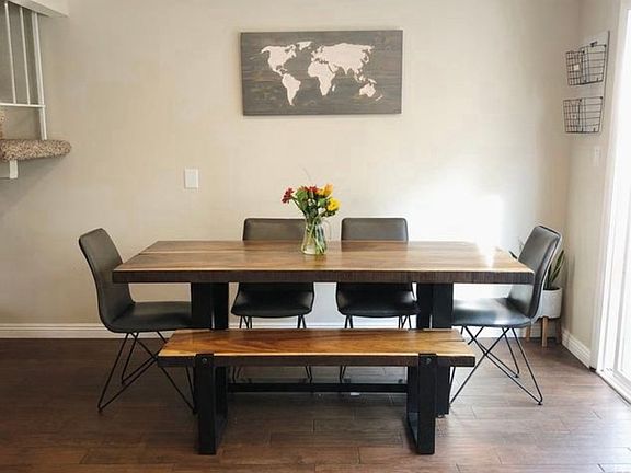 This rare opportunity offers a beautifully renovated townhouse Front Unit Highlights: Downstairs: -Woodgrain tile flooring, -modern subway tile backsplash in the kitchen, -spacious "pantry style" cabinet, -a charming built-in patio set for outdoor entertaining. Upstairs: - Both bedrooms feature ensuite bathrooms, - Brand new vinyl flooring throughout, - Stylish barn doors with frosted glass, - Large walk-in closets - Luxurious bathrooms with custom tile work. - One bathroom boasts an extra-wide bathtub, while the other includes an incredible double shower. Exterior: - Enjoy beautifully landscaped greenbelts filled with vibrant flowers, - Mature trees, - Lush greenery. - The complex also offers access to a pool, tennis court, and pickleball courts. Complex Amenities: - Pool, playground, and tennis court Additional Features: - Washer/dryer located in the garage (included, shared with Studio rental over garage) - Refrigerator, oven, and microwave (included) - One garage parking space plus one complex parking permit - Patio is a shared space between both units. This property won't last long serious inquiries only! Don't miss your chance to live in this unique and highly desirable home! 12 month lease Renter pays for utilities that include gas, electric, and internet No pets
