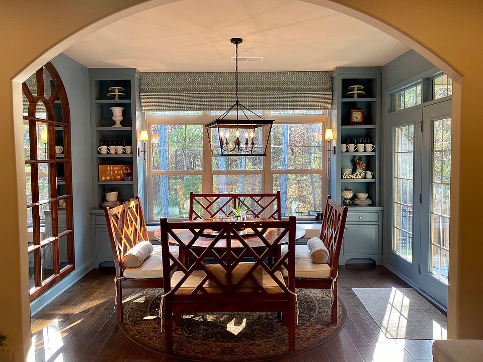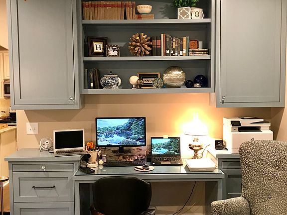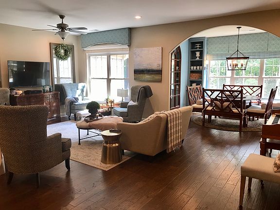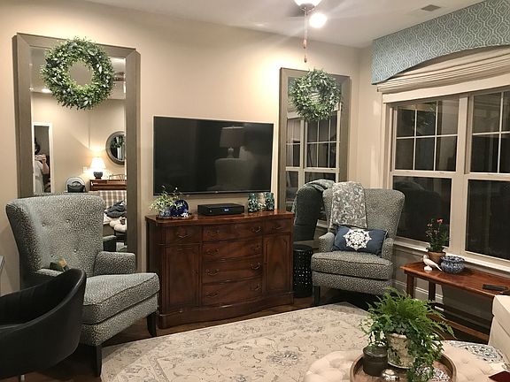 Under contract, showings continue by appt only. The Grove at Five Oaks. Coveted Georgetown plan. TWO MAIN FLOOR BEDROOMS AND TWO FULL BATHS, plus ADDITIONAL TWO ROOMS and FULL BATH UPSTAIRS (one room upstairs currently used as a bunk room with two double beds and plenty of room to spare). Main floor master bath has frameless glass walk-in shower. Second downstairs bath and third bath upstairs both have tub/shower combo. Floored attic space for storage. Smart home - can control lights, garage door, security cameras from smart phone - easy to use - all equipment is new and can remain. Designer updates include tumbled glass backsplash, granite counters, custom window treatments, custom cabinetry in master bedroom with shoe shelves galore, custom cabinetry in dining room with window seat and custom cushion, custom cabinetry in office area, insulated garage door panels, fenced backyard with puppy picketing and arch top gate, lots of added can lights, custom lighting and more. Can entertain 20+ easily in this great room. Love the maintenance free living - yard work and irrigation incl in monthly dues. Best part is the private wooded lot in back! Located right next to the model home. Price can include nearly brand new appliances incl washer, dryer, stainless refrigerator with ice in door, and wall mounted flat screen tvs. Totally turnkey.