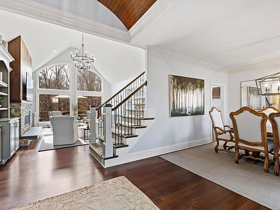 This pristine home effortlessly combines comfort, convenience, and modern elegance. Upon entering, you are immediately captivated by open sight lines leading to the stunning full-length windows, which frame picturesque views of the natural surroundings. The foyer makes a striking impression with a unique wood ''barreled'' ceiling, adorned with tongue-and-groove wood boards. The open-concept family room and kitchen are designed to maximize both space and light, with vaulted ceilings that enhance the airy, inviting atmosphere. The gourmet kitchen has been thoughtfully updated with custom cabinetry and high-end appliances, while a gas fireplace with a stacked-stone surround and natural wood accents adds warmth and charm. The main-level primary suite offers a private retreat, complete with its own gas fireplace, direct access to the deck, and a beautifully remodeled bathroom. The lower level is an entertainer's dream, boasting two expansive recreational spaces, including a second family room with a wet bar and a third fireplace, also accented by stacked stone and a stained wood mantle. Wooden beams throughout this level add to the home's cozy ambiance. A remodeled adjoining bathroom leads to a private and spacious guest bedroom. This level also features motorized blinds controlled by remotes throughout the home, a second home office with serene views of the landscaped backyard, and a custom-built cherrywood wine cellar with a 1,000-bottle capacity and a chiller. Additionally, a soundproof home gym, located beneath the garage, provides a dedicated exercise space. Upstairs, you will find two additional guest bedrooms, each with vaulted ceilings and updated ensuite bathrooms. A generous bonus room offers versatile space for games, hobbies, or family activities. The outdoor areas are equally impressive, set on a heavily landscaped lot that adjoins a private natural area. Multiple entertainment spaces include a cozy screened porch with vaulted ceilings, a covered stone patio featuring an outdoor kitchen and bar, two additional decks, a gas fire pit, and another stone patio—ideal for gatherings and relaxation. This home seamlessly blends luxurious amenities with thoughtful design, offering an exceptional living experience both indoors and out.