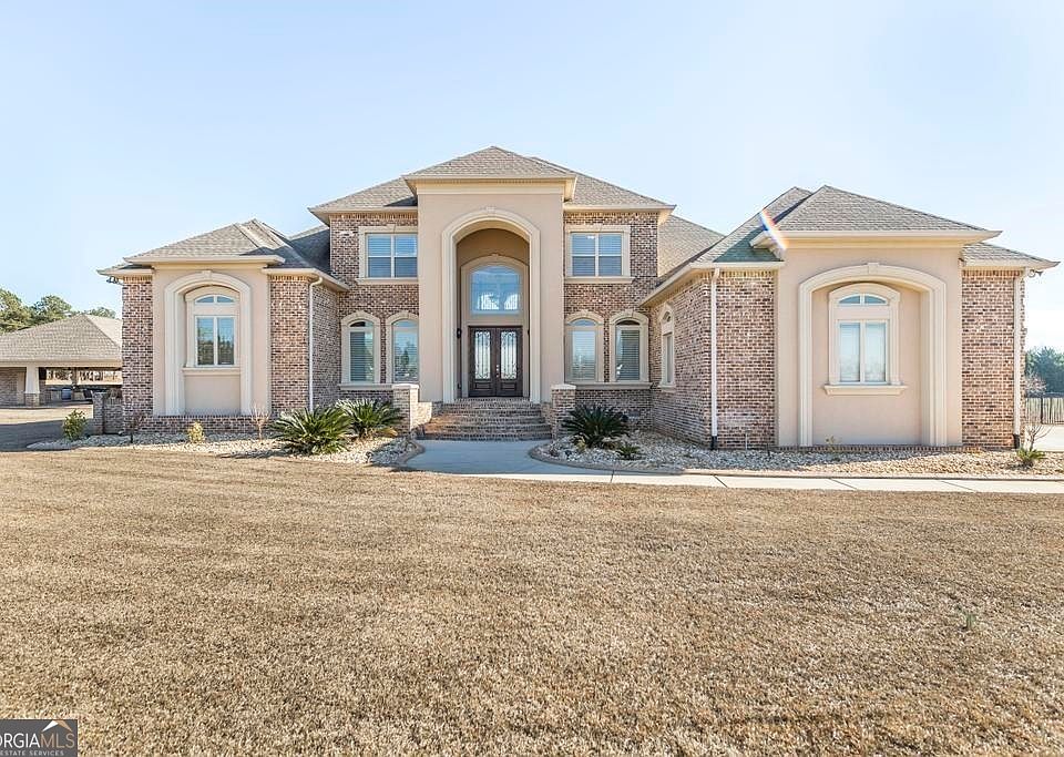 This simply breathtaking all brick and stucco exterior home is located on 8 acres in a gated community in beautiful Perry, GA. The home’s elegance and thoughtful touches make it the entertainer’s dream. Built in 2016, the home boasts a stunning 5 bedrooms, 4.5 bathrooms, a theater room, and 4,321 sq. ft. When you arrive at 1004 Eagle Feather Drive, you are greeted by a long driveway, custom brick entryway columns, and palm trees, making you and your guests feel transported to an oasis. As you step through the gorgeous wood stained double doors into the grand foyer you are welcomed by a stunning chandelier and marble flooring. As you continue into the open concept home you will see the formal dining room and a sitting room or office. As you walk into the connected living room and kitchen, you see the home is bright and welcoming with lots of natural light. The centerpiece of the spacious living room is the gorgeous stacked stone fireplace. The kitchen has beautiful custom cabinetry, a gas cooktop, bar seating, an eat-in kitchen area, a beautiful backsplash, and stainless steel appliances throughout. The home boasts a spacious laundry room with custom cabinetry for storage. Each of the five bedrooms have light and bright carpet flooring for peak comfort and each full bathroom has custom cabinetry and jetted bathtubs. The Master Suite is extremely spacious and boasts its own double-sided gas fireplace in the master bedroom and bathroom. The master suite has an extra room attached that can be used as a bonus private sitting area. The serene jetted bathtub and beautiful tile shower will transport you to peak relaxation. The theater room brings a fun and unique element to this home. From enjoying sporting events or family movie nights in your home, the possibilities are endless. Taking a step out the back door of this home, you see the gorgeous pool with a rod iron fence surrounding and the ultimate outdoor hosting pavilion. The griller’s dream cooking area boasts its own refrigerator, built-in charcoal grill and flattop grill, plenty of counter space, a sink, and storage. This is a great entertaining space for large gatherings of family and friends poolside. The home has an attached two car garage. This home is waiting for you! Schedule your private showing today to get a true taste of its elegance and beauty.