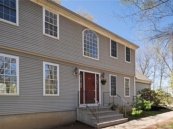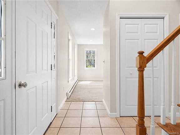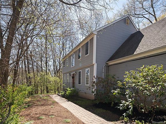 This spacious property offers both convenience and privacy. The house is situated close to shopping and I-91 and is nestled back from the road and surrounded by trees. You will love the open floor plan that features a great room with a gorgeous fireplace. The eat-in kitchen has natural wood cabinets, stainless appliances and a slider that leads outside to the deck. The main level also has a formal dining room with hardwood floors and a half bath. Upstairs you'll find a master bedroom suite a vaulted ceiling, large bathroom with a deep bathtub and stand up shower and a walk in closet. There are 3 additional bedrooms upstairs, a shared bathroom and laundry. The basement is partially finished with a heated bonus room that could function as a quiet home office or even a home gym. There is plenty of room downstairs for storage and walk-out access to the backyard. This house is meticulous inside and out with professional landscaping, freshly painted and newly installed carpets. Shared driveway.