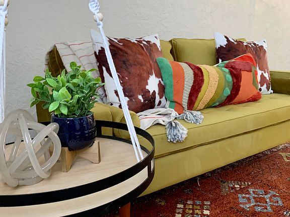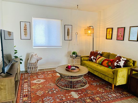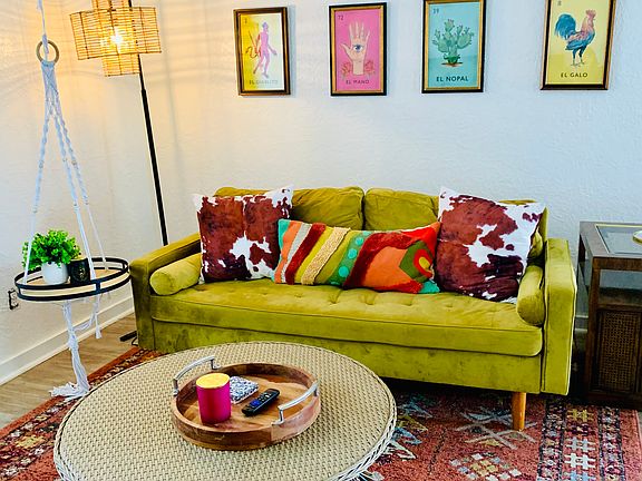 This recently renovated 2-bedroom adobe home combines funky, modern style with warm Southwest vibes, making it the ideal spot for both travel nurses and anyone looking for a unique, comfortable stay. Step inside to find a spacious, inviting living room where you can unwind after a busy day, complete with a large smart TV for all your entertainment needs. Both bedrooms are designed for relaxation, with foam mattresses (the master featuring a luxurious king bed!) to ensure a restful night's sleep. The fully equipped kitchen invites you to cook your favorite meals, and the front patio offers the perfect spot to sip your morning coffee or enjoy a quiet evening under the stars. If you are traveling with a furry friend, they will enjoy sunbathing in the fenced in front yard.