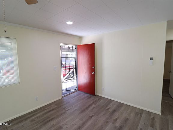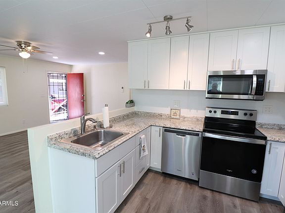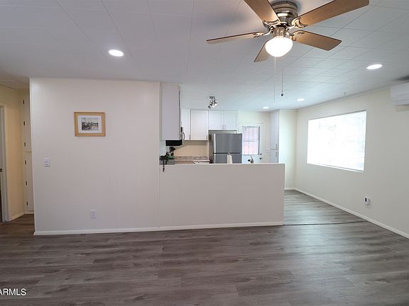 Nicely remodeled home on a shady lot on a quiet street. Great room is open to the kitchen with stainless appliances, and two bedrooms. Large covered front porch the length of the home. A major remodel in 2021 includes: New kitchen cabinets, counters, appliances, plumbing, fixtures. lighting throughout, water resistant vinyl plank flooring, ceiling fans, mini-split HVAC for heat and air, dual pane windows, electric hot water tank, garage door opener, paint inside and out, rain gutters, back deck and walkway to laundry and more. Owner is a licensed real estate agent in Arizona.