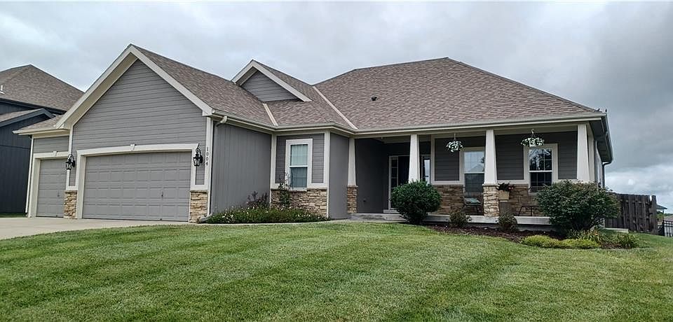This gorgeous true ranch has four bedrooms, three full baths, and an oversized three-car garage with a bonus 10' x 10' mortorcycle bay.  Three bedrooms on the main level! Fantastic curb appeal with an 8' x 24' covered front porch with a view of the pond!  Beautiful stone fireplace.  11' ceilings in the living area with crown molding.  Wood flooring in the kitchen, dining area, living room, kitchen, and pantry.