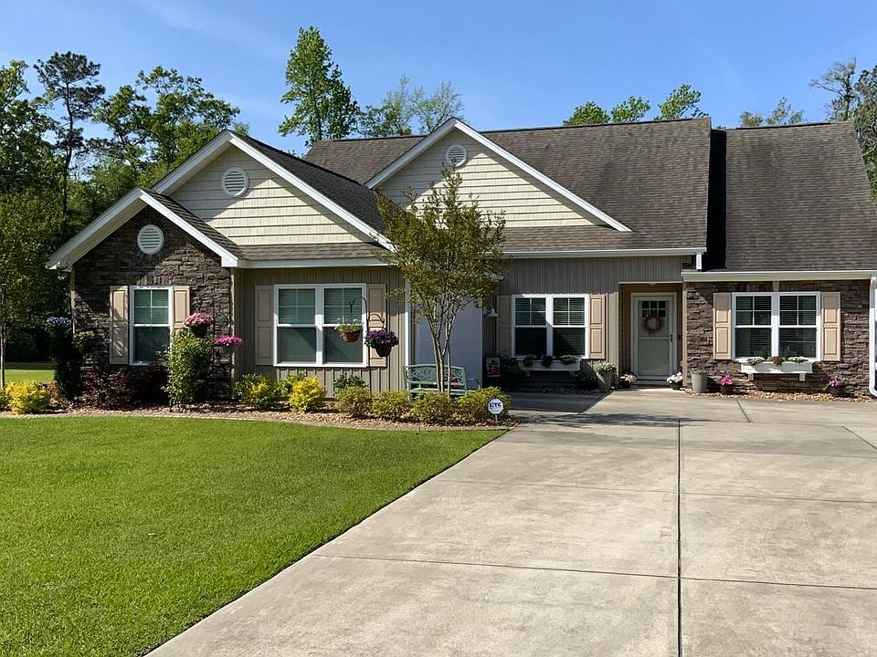 This beautiful custom built home sits on a .60 acre lot backing up to a wooded terrain on a quiet cul-de-sac in the intimate Planters Creek neighborhood. With over 2500 heated square feet, this home offers 4 bedrooms with dual primary suites, 3 full bathrooms, formal dining room, and a flex room off the living room. As you enter the front door you are greeted with cathedral ceilings, brand new flooring, fresh paint and an open floor plan great for entertaining. The kitchen offers stainless steel appliances, granite countertops, pantry and a wet bar or coffee station. As you make your way outdoors, you are immersed in a professionally landscaped oasis with a heated/cooled salt water pool, hot tub, fire pit and a detached garage. The fully insulated detached garage is equipped with a mini split ac making it the perfect versatile space. Additional amenities include a fenced in oversized driveway large enough for a RV, boat, trailer or additional parking, a 10 x 20 shed, and 2 attics providing plenty of additional storage space. This turn key home is centrally located to all that Myrtle Beach has to offer.