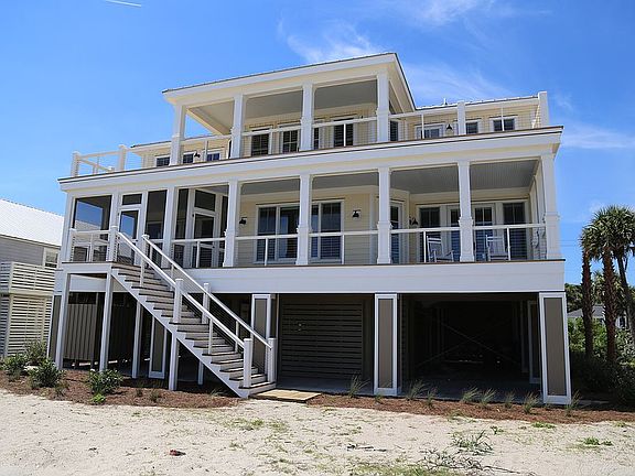 “Loggerhead Lair” is beautifully decorated with splashes of coastal colors, soothing beach accents and comfortable furnishings. Enter into the open, airy living area with fantastic views of the ocean and beach. Large screen TV with surround sound and comfortable seating. Access the covered porch from 2 doors in the living area. Large kitchen/dining combination includes: dining table for 8 and bar seating for 3, wet bar with ice maker, gas stove top and top of the line appliances. Access to the screened porch from the dining area. The screened porch offers additional dining and seating. Kitchen is well-equipped for preparing meals. Laundry closet and a half bath is off the kitchen. Downstairs master bedroom suite is off the den and has a king bed, TV, and entry to the beachfront porch. Master bathroom has walk-in shower, tub and water closet. The downstairs covered porch and screened porch is the perfect place to relax while taking in the sights and sounds of life on the beach. Upstairs den overlooks the beach, offers access to the upper outside deck, has a sleeper sofa, TV and wet bar. There are 5 generous sized bedrooms: 4 bedrooms have connecting bathrooms with tub/shower and TVs. The 5th bedroom has bunk and single bed and hallway bathroom. Two ocean front bedrooms access the open sundeck. Amenities include elevator access to all floors, enclosed outside hot/cold shower, internet access, plenty of parking under house and in the yard, Grill, 6 TVs.