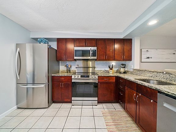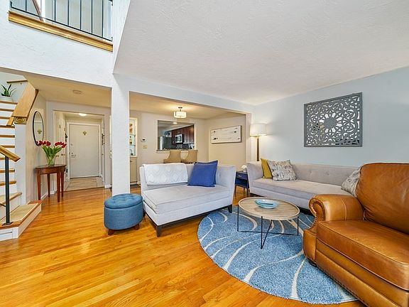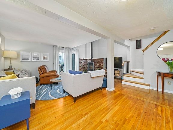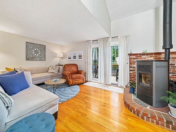 Fall in love the moment you walk into this 3 level townhouse. This open floor plans offers living room with cathedral ceilings, skylight, pellet stove with brick hearth and dining area complete with wet bar. Well-appointed kitchen with cherry cabinets, granite countertops and brand new appliances (2022). Sliders lead to deck overlooking private fenced yard, which is mowed and maintained for you. Spacious master bedroom with cathedral ceilings and walk in closet. Nice size 2nd bedroom. Beautifully updated full bath with crisp white tile and glass shower door. Finished lower level with large family room /possible 3rd bedroom that walks out to outdoor space. Newer heating/cooling system. Well maintained complex with new roof, sealcoating, and composite front porch. Conveniently located minutes from commuter rail, T, bus line, Derby Shoppes, restaurants, and highway.
