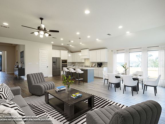 Home office with French doors off extended entry with 12-foot ceiling. Spacious family room with wall of windows opens to kitchen and dining area. Kitchen offers large walk-in pantry, 5-burner gas cooktop and generous island with built-in seating space. Private primary suite includes bedroom with wall of windows. Dual vanities, corner garden tub, separate glass-enclosed shower and large walk-in closet in primary bath. Secondary bedrooms plus a guest suite with full bath complete this open one-story design. Abundant closet space throughout. Covered backyard patio. Mud room off three-car garage. Representative Images. Features and specifications may vary by community.