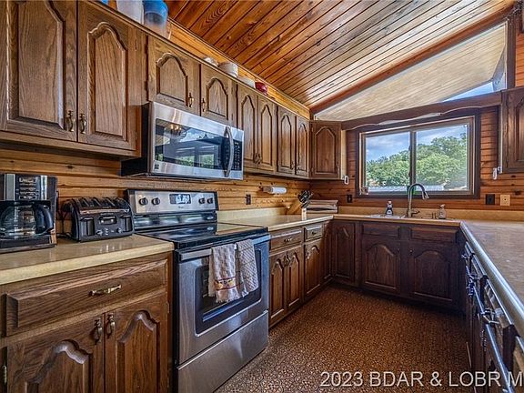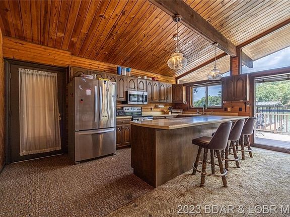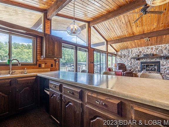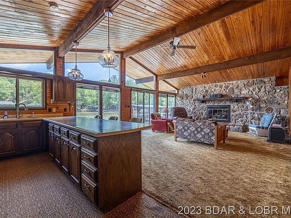 The perfect lake set up with ZERO steps! Located on the desired Sellers rd in Camdenton this 3-bedroom, 2 bath home features the MOST level lot you can buy. Step inside and you will notice the wood vaulted ceilings throughout the home, wide open kitchen/living & dining areas, beautiful native stone fireplace and tons of windows allowing for natural lighting. Stroll down the hallway to 2 guest bedrooms with wood vaulted ceiling & a updated guest bathroom. Master bedroom located at the back of the home with an updated master bath with walk in shower. A few updates is all this lake home is needing to make your own. 2 Car garage with a large wood working shop on the back side that is heated & cooled with a Mini split unit, step outside to the 1 well 10x28 dock with lift & swim platform and take in the gorgeous lake views in your no wake protected cove at the 35mm! These homes rarely come on the market so take advantage today!