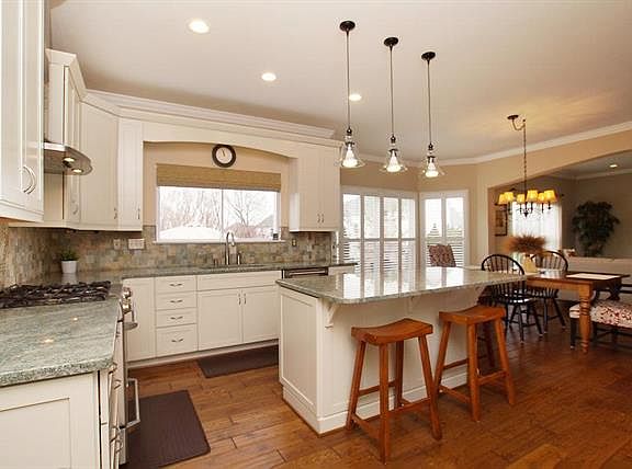 - Kitchen: Center Island, Custom Cabinetry, SolidSurfaceCounter, Eat-In Kitchen, Breakfast Room, Walk-In Pantry