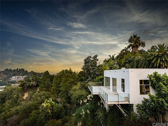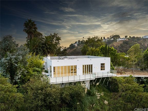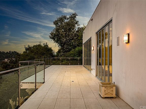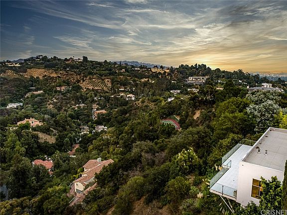 Immaculate Bel Air Modern Home with Mountain Views! Perched amongst a gorgeous mountaintop surrounded by palm trees and a verdant landscape, enter through a double-gated entryway to a formal foyer where natural California sunshine gleams throughout every corner of the home from the open skylights and floor to ceiling windows overlooking the stunning landscape. Recessed and modern pendant lighting flow from the gourmet kitchen with custom cabinetry, center island, and top-of-the-line stainless steel appliances, to the expansive living area with a wine wall, wood-burning fireplace, and fully expandable sliding glass doors to a one-of-a-kind indoor/outdoor living experience on a dramatic wrap-around balcony/patio. Two master suites each boast their own en suite bathrooms, walk-in closets, and direct access to the patio. Other amenities include a separate laundry room, powder room, security system, and a two-car garage. Enjoy serenity, convenience, and ultimate privacy when you reside in this Bel-Air Masterpiece.