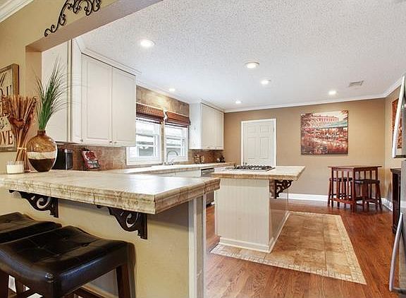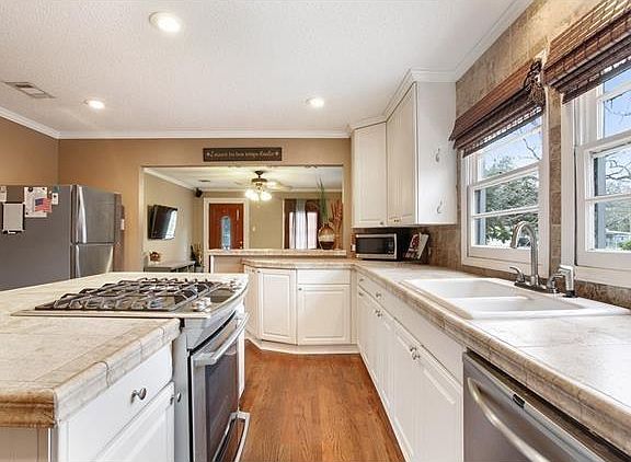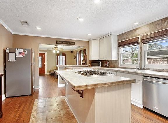 Raised cottage, renovated in 2000. 12 X 22 (273 s.f.) out building being used as man cave, could be office or MIL apartment. 12 X 8 shed, 20 X 15 tiled patio, 8 X 7 porch (none of which is included in living area). Kitchen has island on tile floor inlaid into oak floor, s/s gas stove, dishwasher, and fridge. Double paned vinyl windows, recessed lighting, cabinets to ceiling, crown molding, frosted glass light in front door. original-looking wood floors. Huge trees provide evening shade. Off street parking
