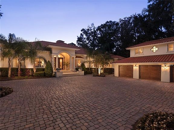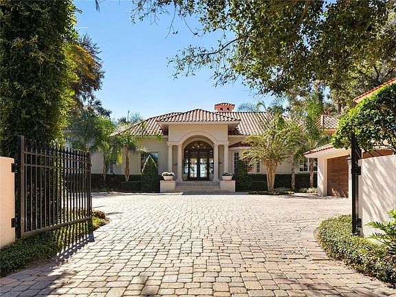 This Florida architectural design custom home is perfectly sited on Lake Butler of the Butler Chain of Lakes in Olde Windermere. Upon entering, natural light from the broad front doors visually link the formal areas to showcase a stone fireplace and elegant chandelier in the foyer. The living and dining rooms are beautifully detailed featuring a wall of glass inviting stunning lake views with crown molding and elegant stone flooring. Just off the entry a private study offers extensive custom woodwork. The casual family space boasts panoramic lake views through the rear wall of windows and French doors; pairing stone flooring with modern finishes and opening naturally to an oversized covered lanai. The gourmet kitchen is well equipped with granite countertops, custom cabinetry, oversized pantry and upscale appliances. The family areas are bathed in natural light and open to the sparkling resort style pool and spa finished with stone pavers and offering spectacular lake views. The expansive backyard leads to boat dock with two covered boat lifts and a dual jet ski lift. A perfect retreat the master suite captures prime lake views. Walk in closets, garden tub, large shower, and his and hers vanities highlight the master bath. The secondary bedrooms are perfect for growing families. Walk or hop in your golf cart to enjoy downtown Windermere activities including playground, parks, dining, tennis courts and much more.