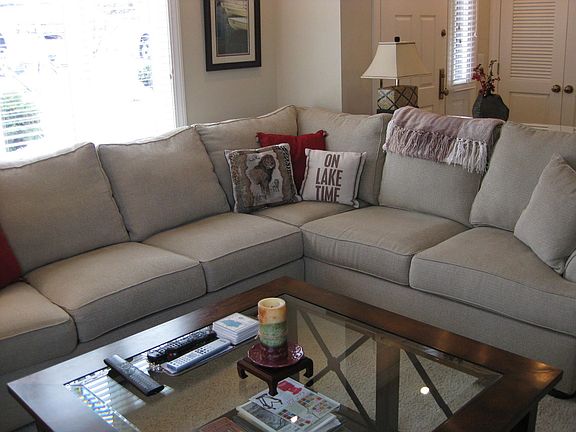 Fully furnished with Ethan Allen. List price includes 2010 Kayot Deck Boat with Bimini blue top and lift, 2008 Yamaha blue and white PWC with lift and more. Custom made cherry cabinets, stacked stone, granite counters and custom built details. Fireplace in living room and master bedroom. Custom leaded glass glass doors. Being an end unit the lake views are wonderful from inside and on the patio. Detached Garage is perfect for storing lake toys, golf carts, and bikes. Must see this very special unit. Walk, bike or golf cart to shops. Pier space included. Not included: personal photographs and brass lion.