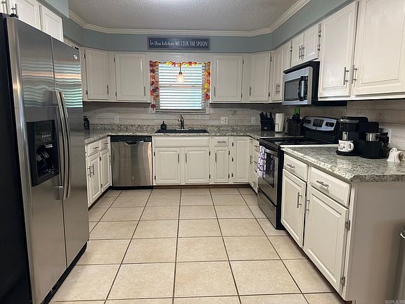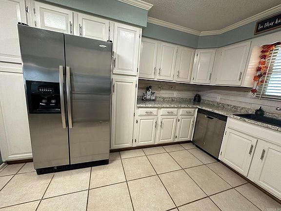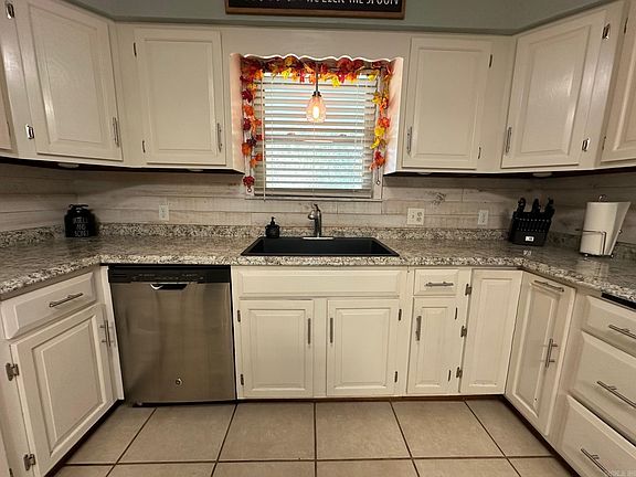 Three bedrooms and two bathrooms, with a very large living room, vaulted ceiling with painted wood beams, wood burning fireplace, large front windows, open to kitchen area, pantry and refrigerator will convey. Dining area has built in bench for storage and seating. Primary bedroom is a great size with french doors leading out to the cozy patio. Great walk-in closet in primary. Fenced in backyard, portable metal building will convey. New roof 2024, water heater Dec 2022, AC unit compressor replaced in June 2023. Smart thermostat, Ring doorbell, Vivint security system (transfer to new owner).