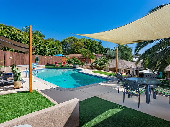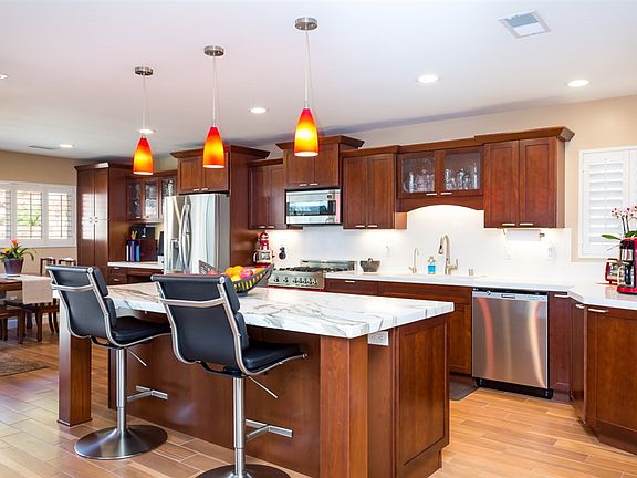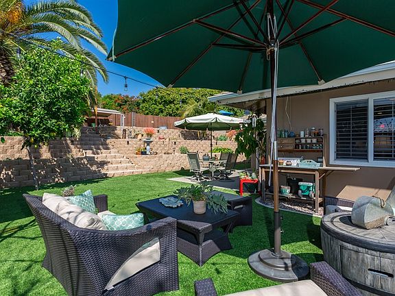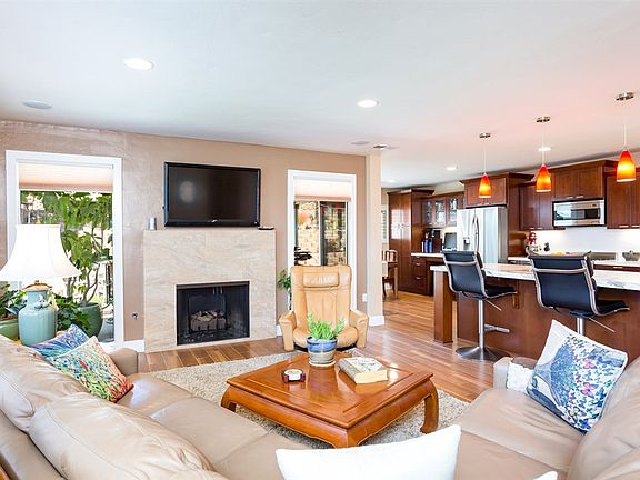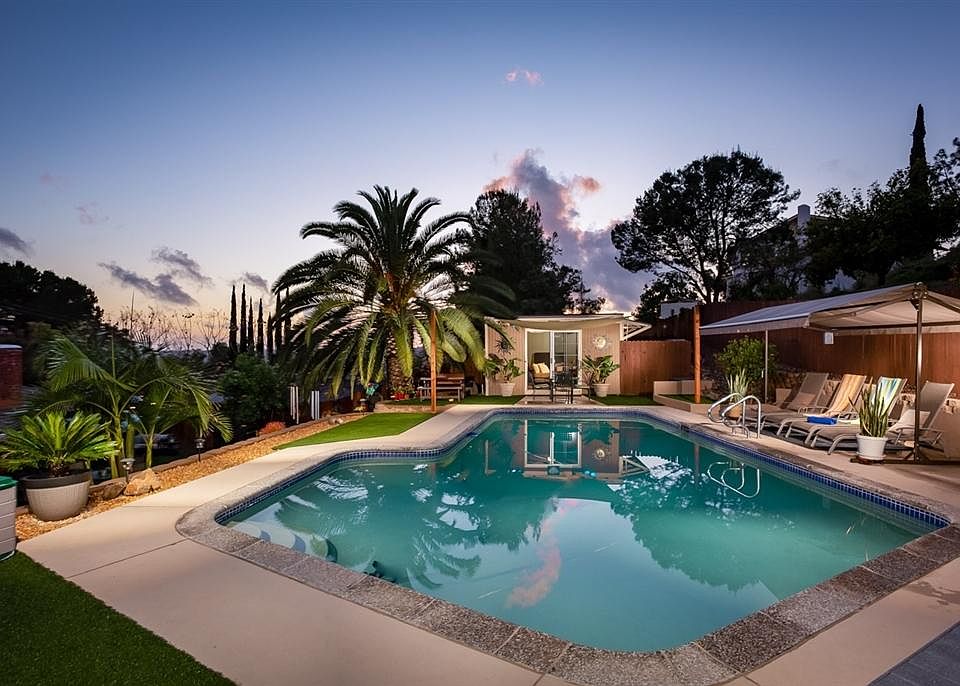Modern and Sophisticated Mid-Century - Stunning Home in Mount Helix Southridge This exquisite home has been remodeled throughout! The kitchen upgrades include: cherry wood cabinets with soft close mechanism, glass display cabinets, quartz countertops, an 8-foot kitchen island with Calcutta white marble, stainless steel appliances, Bertazzoni gas range & microwave, LED pot lighting, a wine cooler, and more. This home is a 4BR/2BA + detached bonus pool room that can be used as a home office or a playroom. The home features an open layout; the kitchen, the dining room and family room flow uninterrupted and give the impression of more square footage. The floors are stylish and durable with ceramic tiles featuring a wood-look. Also, the family room is bright with full-sized windows that frame the backyard and a gas fireplace for those cool nights. The master bathroom and guest bathroom have been remodeled too! When in the private backyard, you feel like you are at a resort. Enjoy the large pool and deck area for lounging, sunbathing or relaxing under the palm tree. You even have a separate pool house to get out of the sun, work from home, play music or just party. Per owner the pool has durable granite-based plaster finish and the bonus pool room 10 x 15 has a newer roof (2015). The rest of the backyard features terraced planting areas with irrigation, citrus trees, energy saving artificial turf, trek decking, and a spa/jacuzzi pad outside of the master bedroom wired for 220V. The home sets on a quiet street and features a gated entry, a newer driveway, a newer roof & gutters, white shutters, dual paned windows, a soft water system, a reverse osmosis system, ceiling fans in the bedrooms, a newer heater and air-conditioning, a sound system in the living room, rain barrels for conservation, and an upgraded electrical panel. (per owner - buyer to verify and specify included items in offer).