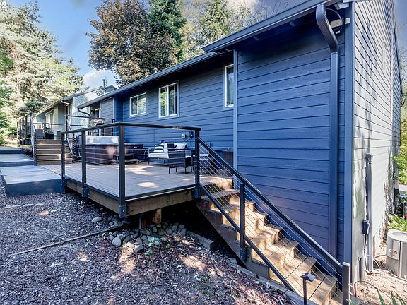 Updated Contemporary 3 bedroom home close to parks and an easy commute to Multnomah Village + downtown. Soaring vaulted ceilings, Skylight with a ton of other natural light, hardwood floors, open concept living/dining. Stunning master suite w/ luxury bathroom remodel. Full main bath remodel w/custom tiling. High efficiency gas furnace, AC, tankless water heater, double pane windows & trex decking. Multiple outdoor areas for entertaining + hot tub.