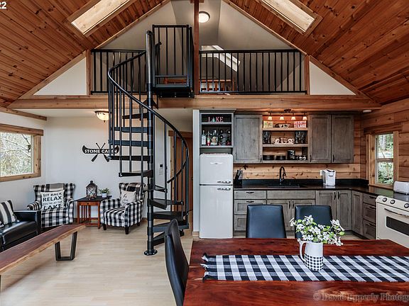 THIS ONE IS ADORABLE!You have to see your own little furnished cabin at the lake where you can enjoy right away.No detail spared in making this one of the best in the community.Open deck to relax in the Oregon summers or prop your feet up by the woodstove in the winters.Leathered granite counters,retro appliances,spiral staircase to the loft bedroom & updated bathroom.Fishhawk Lake Community offers a ton of amenities & you have quick access to the rec center, pickle ball courts, beach access.