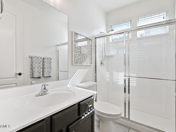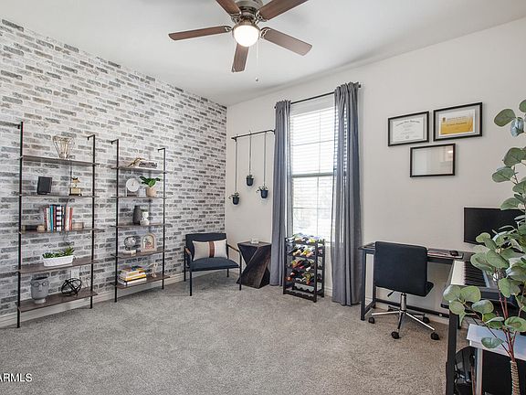 This 3 bedroom, 3 bath home with a flex room is the one! It features 9 ft ceilings, New paint & Light fixtures throughout the home and New LVP flooring in the living room. The Kitchen has Beautiful Granite counters, Mosaic backsplash and Stainless steel appliances. The enclosed den can act as another bedroom or an office space. The Primary bedroom has a large bathroom with both a stand alone tub, shower and a large walk in closet. The backyard is complete with a covered patio, putting green and a separate seating area. The Eastmark community offers a community pool, community recreation center, a skate park, recreational fishing lake, dozens of community parks, diner, fresh farm store, local coffee shop and more!