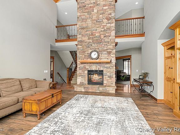 Beautiful home with 300' on Thornapple River. Over 5300 finished sq feet. Enter home to massive double sided Stack Stone fireplace. Family room has floor to ceiling windows with 26 ft ceilings. Enter kitchen with many windows, granite counters and SS appliance. spacious deck off kitchen with view of the inground swimming pool. Formal dining room with unique glass. Main floor master suite with lighted tray ceilings and luxurious bath. Upstairs has 2 large bedrooms with private baths. Lower level has 10ft ceilings, double sided fireplace, kitchen, family room, theatre room 1 bedroom,flex rm, and 1 full bath.. Radiant heat in lower level is perfect for those chilly nights. A few other features of this home are 2x6 construction, 2 furnaces and 2 central airs, Andersen windows & UG sprinkling.