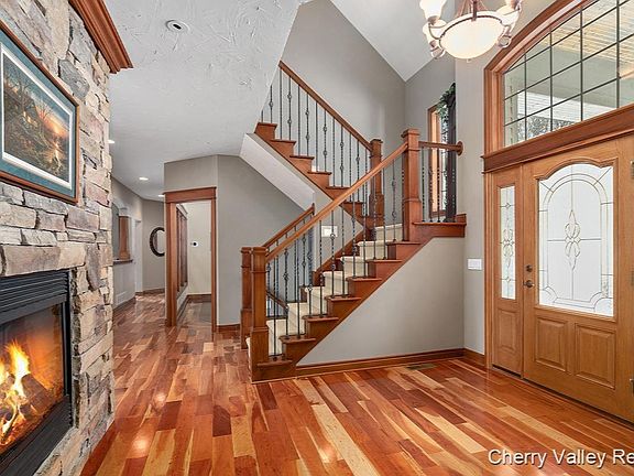 Beautiful home with 300' on the Thornapple River. Over 5300 finished sq feet. Home has massive stacked stone fireplace. Family room has 26 ft ceilings with windows overlooking Thornapple River. Bright kitchen with granite counters and SS appliances. Spacious deck with views of the inground swimming pool. Formal dining room with unique glass panels. Main floor master suite with fresh paint and carpet,lighted tray ceilings and luxurious bath. Upstairs has 2 large bedrooms with private baths. Lower level has 10ft ceilings double sided fireplace, kitchen , family rm, theater rm, 1 bedroom & flex rm, 1 bath. Radiant heat in lower level is perfect for those chilly nights. Other features of this home are 2x6 construction, Andersen windows, 2 furnaces and central air. UG Sprinkling.