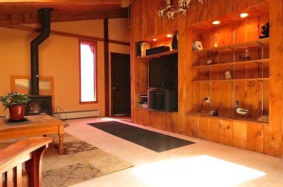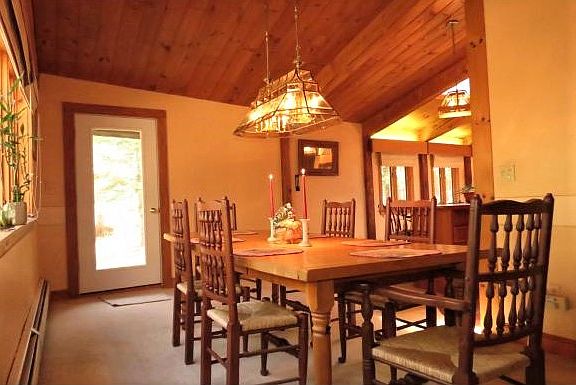 Unique contemporary, open floor plan post and beam home tucked off a quiet country road on 3.5 acres with a meandering stream, foot bridge to the woods and nearby Viking Cross Country Ski trails. Airlock entry/mudroom is perfect for all your ski/snow equipment. A warm wood interior gets flooded with natural sunlight though multiple skylights and transom windows. There is a suite bedroom and two additional guest bedrooms with vaulted ceilings and a loft. An inviting kitchen has seating at the oversized cherry island, propane cooktop with hood, tiled backsplash and is open to the dining and living areas. The living room includes a built-in entertainment area with lighting and a wood stove. Private back deck makes for easy summer entertaining. There is even a separate 2 bay garage/barn and storage shed. Makes a great primary home or getaway.