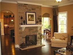 The Bradford. Brick & Stone exterior. Double sided fireplace! Very dramatic. Open kitchen with island. Granite counters. Sun room & sitting room.