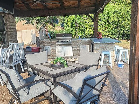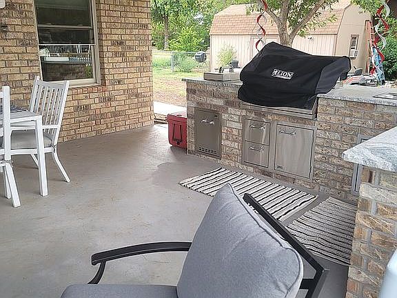 Ranch style home with large Master Bed and Kitchen. Guest room has it's own bathroom. 2023 Pavilion includes an outdoor kitchen and sitting area with, piped in natural gas grill with rotisserie and single burner, sink with instant hot water, refrigerator, storage drawers and cabinets with a trash bin. All incased in brick with a granite sitting area for four at the built in kitchen bar. Ceiling fan and heat makes watching TV enjoyable any time of year in this beautiful outdoor living area. 2023 greenhouse with electric, water and heat to keep those patio plants thriving in the winter and prepare for vegetable gardening in the spring and fall.