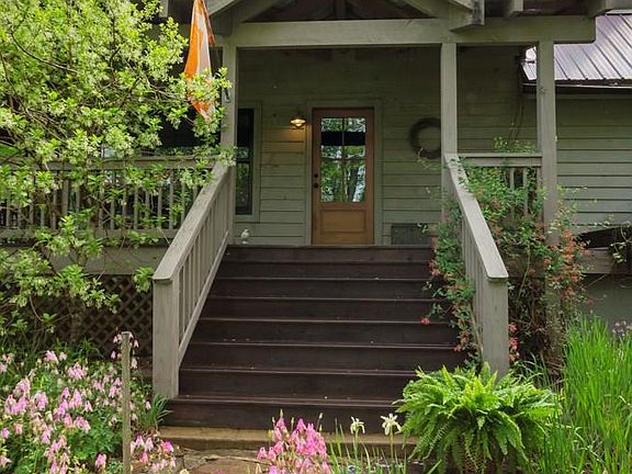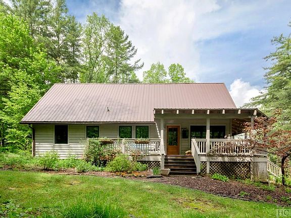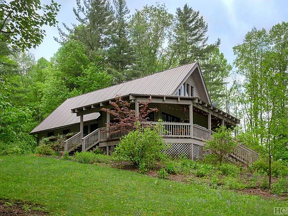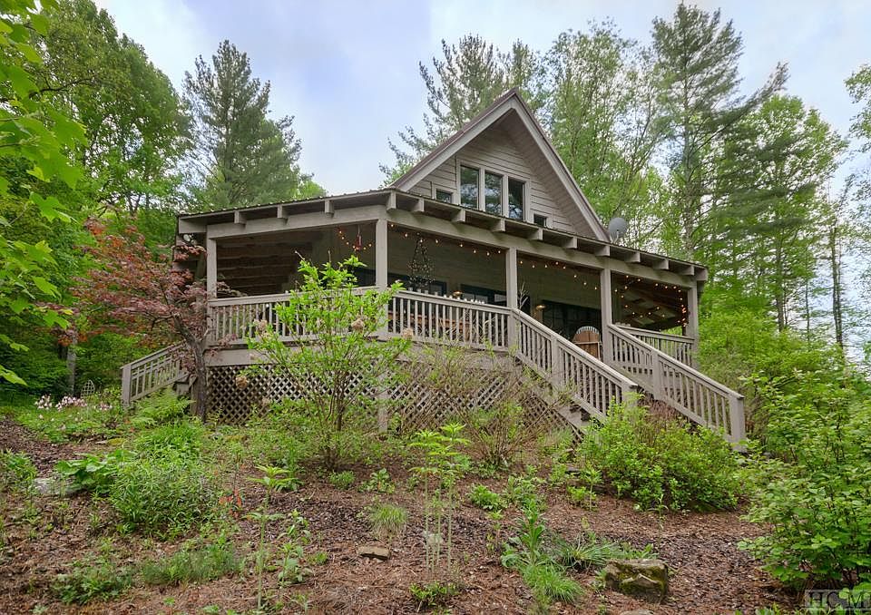 Tucked away on a quiet mountainside, this private hideaway retreat is located at a high elevation to ensure cool mountain breezes. The elegant cottage was recently updated with renovated bathrooms, kitchen, and a sunroom. The 12-foot covered wraparound porch is a gathering place for dining al fresco while enjoying the views and the beautiful gardens with lush landscaping. Personal touches include the new siding made from hemlocks harvested from the property and lovingly made into wood siding. The dining table is also made from reclaimed wood from the property, along with the handmade kitchen island with its beautiful cherry wood top. Some of the upgrades include solid wood double hung windows and doors, shiplap walls, and tongue and groove ceilings. The fireplace is a Swedish heat element gas insert that works on a thermostat to keep the whole house toasty during the winter. The property adjoins 33 acres of deeded nature preservation. Located within five miles of the Lake Glenville public boat ramp and the new public lakeside park, the home is convenient to Cashiers, Franklin, or Sylva. This mountain home is perfect as a getaway for a weekend of R & R to escape the heat of the summer.