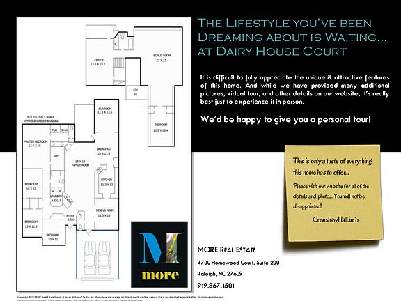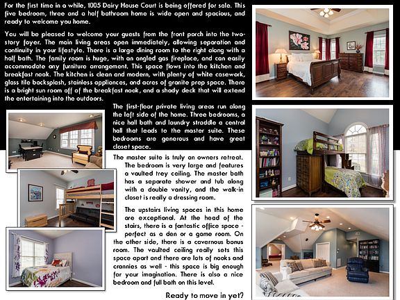 For the first time in a while, 1005 Dairy House Court is being offered for sale. This five bedroom, three and a half bathroom home is wide open and spacious, and ready to welcome you home. You will be pleased to welcome your guests from the front porch into the two-story foyer. The main living areas open immediately, allowing separation and continuity in your lifestyle. There is a large dining room to the right along with a half bath. The family room is huge, with an angled gas fireplace, and can easily accommodate any furniture arrangement. This space flows into the kitchen and breakfast nook. The kitchen is clean and modern, with plenty of white casework, glass tile backsplash, stainless appliances, and acres of granite prep space. There is a bright sun room off of the breakfast nook, and a shady deck that will extend the entertaining into the outdoors. The first-floor private living areas run along the left side of the home. Three bedrooms, a nice hall bath and laundry straddle a central hall that leads to the master suite. These bedrooms are generous and have great closet space. The master suite is truly an owners retreat. The bedroom is very large and features a vaulted trey ceiling. The master bath has a separate shower and tub along with a double vanity, and the walk-in closet is really a dressing room. The upstairs living spaces in this home are exceptional. At the head of the stairs, there is a fantastic office space - perfect as a den or a game room. On the other side, there is a cavernous bonus room. The vaulted ceiling really sets this space apart and there are lots of nooks and crannies as well - this space is big enough for your imagination. There is also a nice bedroom and full bath on this level. Ready to move in yet?