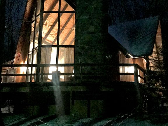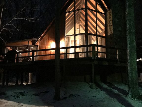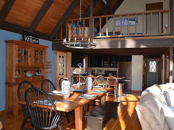 Pristine 4 bedroom plus loft, 2 bath, finished basement, prow front chalet with wrap around deck in all season Wallenpaupack Lake Estates community. Recently updated bathrooms and kitchen with stainless steel appliances. Open concept floor plan with dramatic 26 foot exposed wood beam vaulted ceiling. Windows from floor to ceiling make for a light and bright entertaining space and seasonal water view of Deer Lake. Floor to ceiling stone fireplace provides a warm cozy space for family gatherings. A screened in porch off the kitchen offers a three season entertaining and dining space. WLE is a great family environment where children can drive golf carts and be entertained at the two outdoor & one indoor pool, teen club or beach. Propane heat and central air conditioned. Hard wood floors on main level, 18 inch ceramic tile on basement floor and carpeting in all bedrooms. Perfect home for entertaining with over 2800 square feet of living space on 3 levels. Boat ramp access to Lake Wallenpaupack or lease a dock slip on the lake for your boat or jet ski. For sale by owner, please call or email Cindy at 908-313-0834 or life_imitates_art@yahoo.com if you are interested in more info or to schedule an appointment.