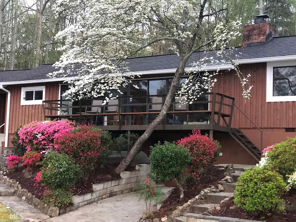 Reduced to sell!Unique 60's design 4BR/3BA bungalow w 229' water frontage. Deeded in a lovely large cove! Perfect getaway or full time home! Great for entertaining on this level lot just a few feet from the water. Fantastic views with wall of windows in great room. Open concept kitchen/great room with masonry fireplace. Ample decks and patios steps from LAKE. Was a full time residence for decades. Floating dock in deep, clear water, granite sea wall, large storage area lake side under home for small boat, wave runners & lake toys. Beautiful zoysia lawn, crisp landscaping, new exterior paint and new septic system. Built in double carport with large storage room, plus free standing carport for additional parking. Furnishings negotiable.