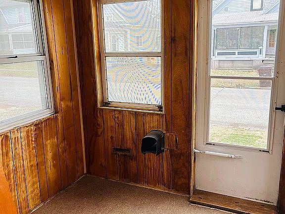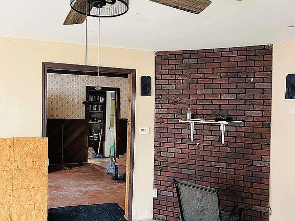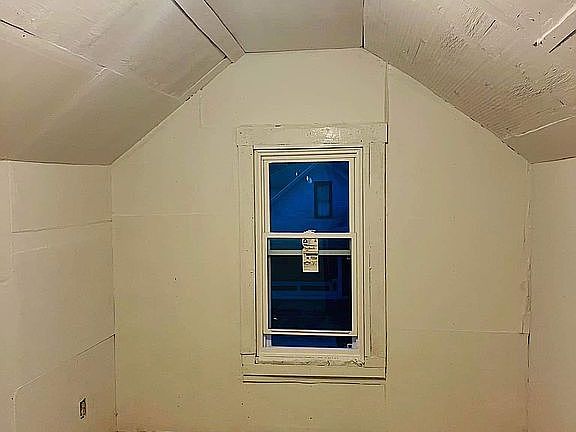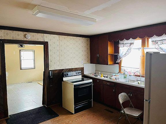 Front porch opens to living room with painted walls and vinyl floor. Kitchen: Wood cabinets, laminate floor, stove and refrigerator included. Bedroom: Carpet floor, painted walls, closet. Bedroom: Carpet floor, painted walls, this room has a staircase constructed that accesses the second floor.Two bedrooms with window type air conditioners and mini fridge on the second floor. Bath: White fixtures, vinyl floor. Included washer and dryer, plus a pull up stairway to cellar type basement. Basement has a new water heater plus a GFA/CAC. Back yard has a 2 car masonry garage. Other small building has been started with construction but not finished.
