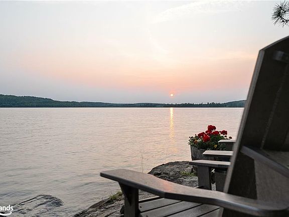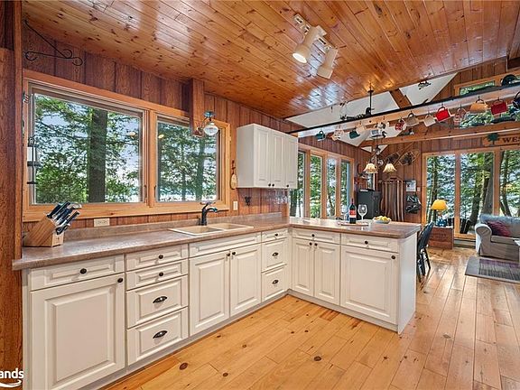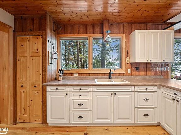 Nestled on the prestigious shores of Redstone Lake, this simply charming and character-filled 3-bedroom cottage beckons as a northern getaway like no other. A point lot with 175 feet of west-facing waterfront, spectacular sun all day and evening sunsets, surrounded by majestic evergreens and the rugged beauty of the Canadian shield, this turn-key retreat offers panoramic lake views that captivate at every glance. Step inside to discover an easy main floor plan where an open concept kitchen with a large pantry/ storage, seamlessly flows into the dining area and great room. The heart of this home, the Great Room boasts a beamed cathedral ceiling that reaches for the sky, a cozy woodstove perfect for chilly evenings, and a grand window wall that brings nature's splendor indoors. As you dine alfresco on the large wraparound deck just off the dining area, you'll feel embraced by tranquility like never before. Throughout this inviting space, tongue-and-groove flooring and ceilings create warmth and coziness in abundance. The spacious hallway entrance and the cozy ground-floor guest bedroom with large window with nature right outside finishes the level off . Venture to the upper level to find two bedrooms exuding comfort alongside a TV room primed for relaxation or entertainment. Redstone Lake is renowned for crystal clear waters, extensive boating opportunities, and the fishing is amazing: Lake Trout, Bass, Pike, Walleye and of course the prehistoric Haliburton GOLD Lake Trout. What else? Firepit for evening smores as the sun sets, Marine Boat Railway, Studio/Games building for the artist or kiddo's. Accessible year round, and great proximity to local amenities, golf, snowmobile trails, Haliburton Forest & Wildlife, Abby Gardens, skiing, hiking and a great general store in West Guilford. One of the best lots and views on Redstone Lake! Isn't it time to start making memories?