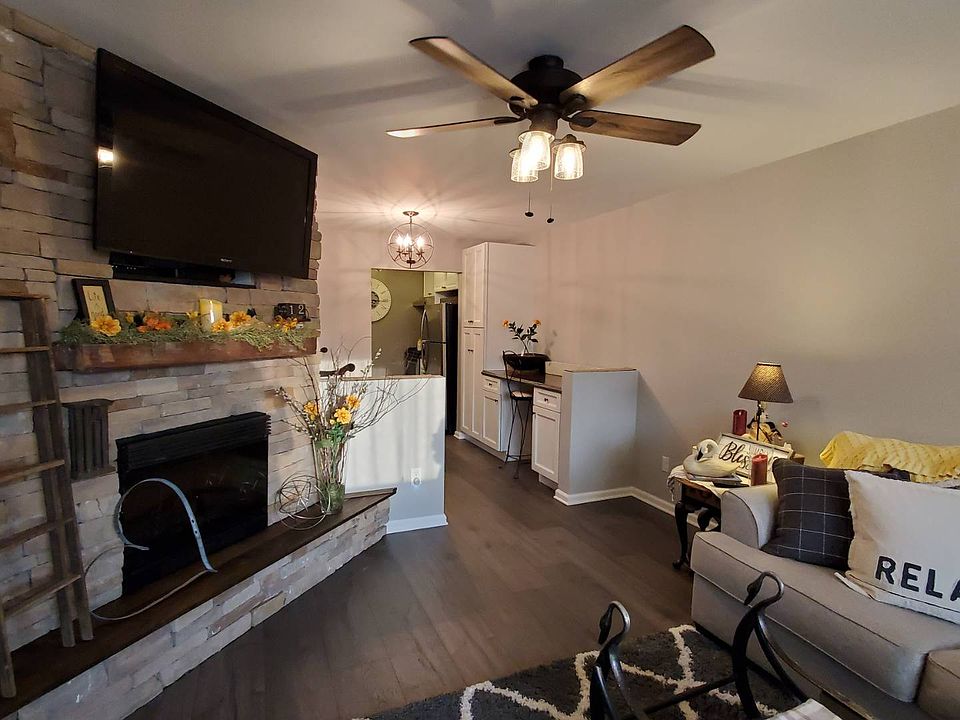 This beautiful, updated unit was entirely renovated from the studs in and completed Feb 2019. Absolutely everything is new: sheetrock, insulation, flooring, furnace, hot water heater, kitchen with 35" tall soft close cabinets, appliances, bathroom. This unique home is the ONLY unit in the complex with a fire place which is surrounded by beautiful stone. Unit has ceiling fans and recessed lighting. You will find many features in this unit that you will not find in any others. This is a dream for first time home buyers or those downsizing and want a new home. Cash or conventional mortgages only in this complex.