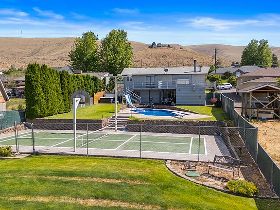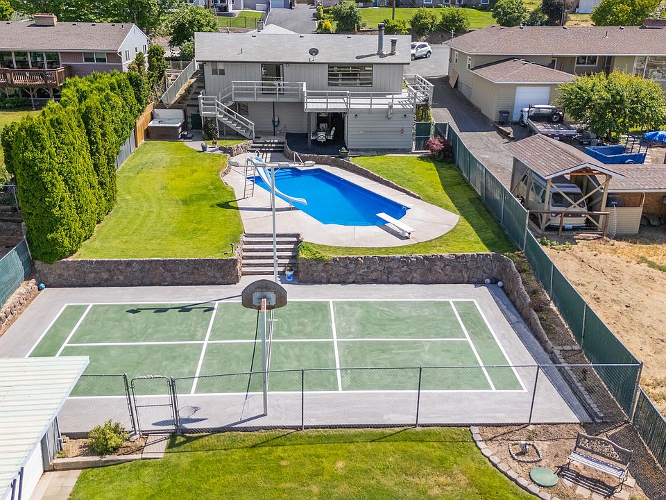 Welcome to this beautiful single-family home with 5 bedrooms, 3 bathrooms, and an attached 2-car garage spread over 2 floors. As you enter, you'll be greeted by a spacious living room with large windows that offer plenty of natural light and a breathtaking view of the surrounding mountains. The upgraded kitchen is complete with new cabinets, stainless steel appliances and a quartz countertop that adds a touch of elegance. The primary bedroom is located on the upper floor and features an en-suite bathroom and a balcony with stunning views of the Yakima Valley. You'll love the luxurious jacuzzi that awaits you after a long day, adding a touch of relaxation to your daily routine. The basement level features a kitchenette and entertainment deck, which is perfect for hosting your family and friends. In the backyard you'll find a gorgeous pool, pickleball court, and a pool house, perfect for summer days and family get-togethers. The backyard is spacious and provides a private area for playtime with the kids. Located within a 5-minute drive, you'll find La Salle High School and other convenient amenities. Such a perfect home for anyone looking for a serene and peaceful living experience in a safe and quiet neighborhood. Don't miss out on the opportunity to make this stunning home your own. Call us today to schedule your private showing!